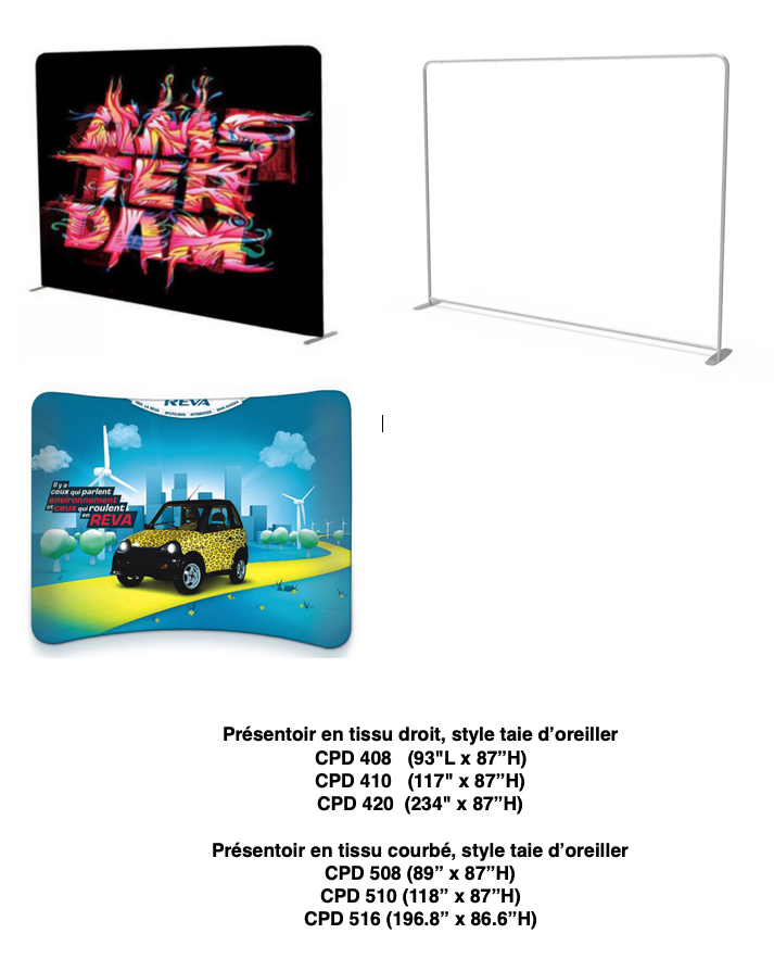 Présentoirs pliants Cliquez sur les photos pour voir plus Série CPD 300 Présentoir courbé avec styrène120″ x 87″H et 100″ x 87″HCaisson de transport inclusLumières incluses Série CPD 200 Présentoir dépliant en tissuDroit ou courbé 117″ x 88″H et 88″ x 88″HSac de transport inclus Lumières en option Série CPD 400/500Présentoir en tissu, style taie d’oreillerDroit ou courbé 93″L, 117″L et 234″ x 87″HSac de transport inclus Lumières en option Série CPD 600 Présentoir en tissu, style taie d’oreillerPlusieurs formats disponibles Afin d'avoir accès aux prix, vous devez être inscrit, cliquez içi CPD-HC Caisson de transport sur roulettes 15.5×28.5×37.5H CL1 -led Lumière pour présentoirs pliants Barrière directionnelle Couleur noir ou chromé Affiche Pour les barrières directionnellesCouleur noir ou chromé Tables CPT 100 Table portable courbéeAjoutez votre visuel CPT 300 Table portable avec tabletteAjoutez votre visuel CPT 400 Table portable, surface de travail 32″ x 17″Ajoutez votre visuel Tables avec tissu CPT 600/610 Table portable courbée en tissuAjoutez votre visuel CPT 620 Table, fabric with velcro L111 × W33 × H101cm Ajoutez votre visuel CPT 630Avec lumières LEDL106 × W40 × H105cmAjoutez votre visuel Supports à revues CLR 200V Support avec valise en aluminium CLR 300 Support en métal avec table en bois Série CLR 400 CLR 404 Support à 4 revues en tissus CLR 408 Support à 8 revues en tissus